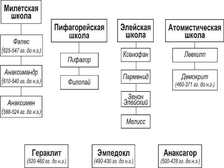 Досократики (6 – сер. 5 вв. до н. э. ). Первоначально античная философия развивается в Малой Азии (Милетская школа, Гераклит), затем в Италии (пифагорейцы, Элейская школа, Эмпедокл) и на материковой Греции (Анаксагор, атомисты). Главная тема ранней греческой философии – первоначала мироздания, его происхождение и устройство. Полагая, что рождение и гибель природных вещей происходит не случайно и не из ничего, они искали начало, или принцип, объясняющий закономерную изменчивость мира.