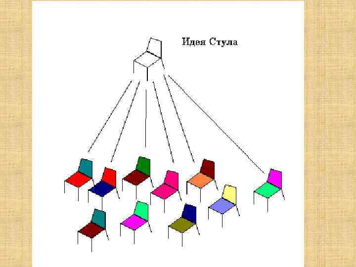 Учение Платона о мире идей • Бытие состоит из двух миров: Мира Идей и мира вещей. • Мир вещей – привычный нам материальный мир. Он временен и изменчив. Однако у любой вещи есть её сущность или прообраз. Он называет это идеей или эйдосом (формой). • Эти идеи – не мысли! Это идеальные (бестелесные) предметы, модели, суть которых воплощают вещи. Они объективно существуют в особом, вечном мире – Мире (царстве) Идей.