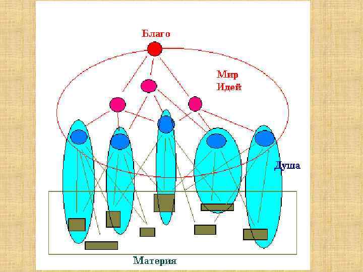 • В этом царстве идеи образуют строгую иерархию, в которой частные идеи (идеи вещей) подчинены более общим (например, идея яблони – подчинена идее дерева, растения…). Существуют также идеи свойств, отношений, математических объектов. • Выше всего находятся эталоны этических принципов – например, «прекрасное» , «добро» , «справедливость» и т. д. . А во главе всего мира идей находится идея Блага.