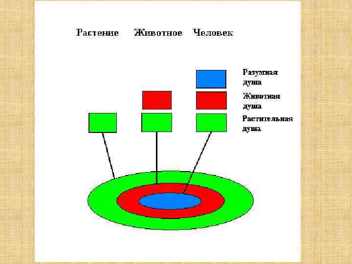 Учение Аристотеля о душе • Согласно Аристотелю, существует три уровня души: 1. Растительная душа (ей свойственны рост и размножение); 2. Животная душа (ей присущи также ощущения и желания); 3. Разумная душа (она способна к рассуждениям и мышлению). Этот уровень души свойственен только человеку. Таким образом, душой обладает ВСЁ ЖИВОЕ.