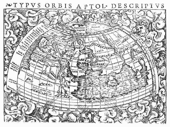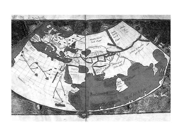 Карта Птолемея • Праотец всех современных географических карт земли: 1 общая карта, 26 региональных • Использование сетки координат для установления локаций • Размеры земли уменьшены на ¼, а размеры Евразии сильно преувеличены • Плоскостное изображение круглой Земли
