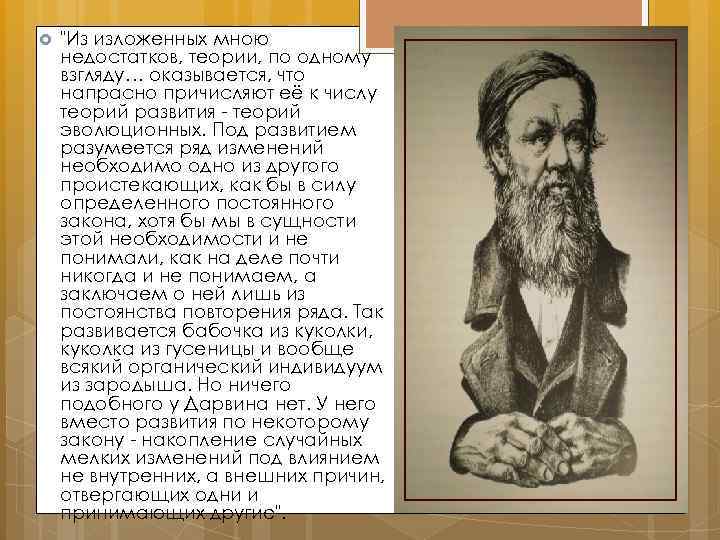 "Из изложенных мною недостатков, теории, по одному взгляду… оказывается, что напрасно причисляют её к числу теорий развития - теорий эволюционных. Под развитием разумеется ряд изменений необходимо одно из другого проистекающих, как бы в силу определенного постоянного закона, хотя бы мы в сущности этой необходимости и не понимали, как на деле почти никогда и не понимаем, а заключаем о ней лишь из постоянства повторения ряда. Так развивается бабочка из куколки, куколка из гусеницы и вообще всякий органический индивидуум из зародыша. Но ничего подобного у Дарвина нет. У него вместо развития по некоторому закону - накопление случайных мелких изменений под влиянием не внутренних, а внешних причин, отвергающих одни и принимающих другие".