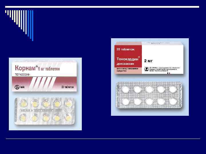 Селективные α 1 адреноблокаторы – Празозин (Минипресс), Доксазозин (Тонокардин), Теразозин (Корнам), блокируя постсинаптические α 1 адренорецепторы сосудов, вызывают расширение сосудов и уменьшение ОПСС, что приводит к снижению артериального давления, вследствие чего вызывают рефлекторную тахикардию. Блокируя α адренорецепторы вен, понижают венозное давление. «Феномен первой дозы» , который проявляется ортостатической гипотензией, может возникнуть (у 25% пациентов) после приема начальной дозы Празозина, поэтому важно начинать лечение артериальной гипертензии с наименьших (пороговых) доз препарата (1/2 таблетки на ночь) с последующим их увеличением.