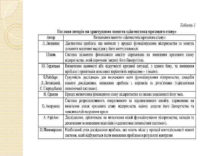 Сутність та завдання діагностики кризи розвитку підприємства в сфері туризму Аналіз літературних джерел та існуючих підходів до трактування поняття «діагностика кризового стану підприємств» показав, що на сьогоднішній день ще не розроблена єдина точка зору щодо розуміння сутності цього поняття. Різні автори вкладають у нього різний зміст, залежно від цілей та способів проведення. Погляди окремих вітчизняних та зарубіжних авторів на трактування поняття «діагностика кризового стану» зведені у таблиці 1.