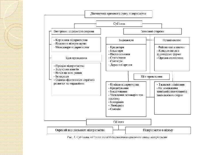 Важливою вона також є і для окремих органів державної влади, інвесторів, кредиторів, страховиків, конкурентів, клієнтів тощо. ЇЇ результати дозволяють зазначеним сторонам уникнути зайвого ризику від партнерства з досліджуваним об’єктом та забезпечити стабільність і збалансованість національної економіки. Відповідно до цього, суб’єктами діагностики кризового стану підприємств можуть бути внутрішні зацікавлені сторони та зовнішні зацікавлені (незацікавлені) сторони. Перелік суб’єктів, об’єктів та цілей діагностики наведений на рисунку 1.