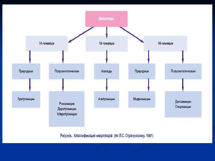 Макролиды Содержат молекуле макроциклическое лактонное кольцо в , связанное с одним или несколькими углеводными остаткам Клинически значимая природная активность макролидов Streptococcus pneumoniae Streptococcus pyogenes Haemophilus influenzae Mycoplasma pneumoniae Chlamydia trachomatis Mycoplasma/Ureaplasma Helicobacter pylori респираторные инфекции урогенитальные инфекции язва желудка и 12 -п. кишки