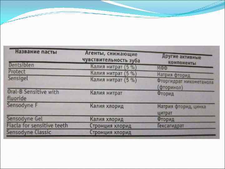 Механизм действия В процессе чистки зубов происходит высвобождение активных компонентов паст гидроксиапатита, трикальций фосфата хлорида стронция и аналогов, которые заполняют дентинные канальцы центростремительно, от периферии к центру, от входного отверстия вглубь канальца. После закупорки входного отверстия прекращается отток ликвора из дентинных канальцев наружу, восстанавливается внутриканальцевое осмотическое давление, исчезает болевой симптомокомплекс на внешние раздражители. Зубная паста, содержащая 5% (KNO 3) уменьшает интердентальную активность нервов и прерывает болевые импульсы. При этом необходимо использовать зубную пасту в течение нескольких дней, чтобы заметить разницу, а также использовать очень мягкие зубные щетки.