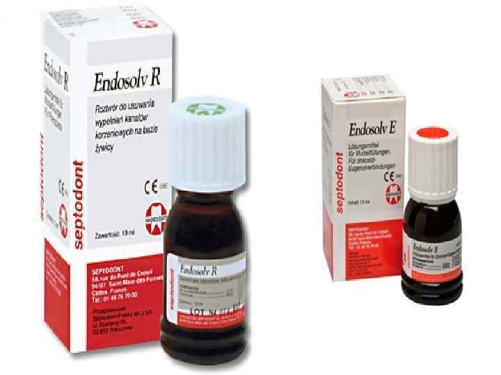 Endosolv "Е" Endosolv "R" ЭНДОСОЛЬВ - препарат для распломбирования каналов. Состав: ЭНДОСОЛЬВ Е (распломбирование эвгенатов) n Тетрахлороэтилен - 92, 30 г n Наполнитель в количестве достаточном для 100, 00 г ЭНДОСОЛЬВ Р (для фенопластных смол) n Формамид - 66, 50 г n Наполнитель в количестве достаточном для 100, 00 г Свойства: размягчающе действует на временные материалы для пломбирования каналов из классического эвгената (ЭНДОСОЛЬВ Е), а также на материалы для пломбирования каналов, в состав которых входят фенопластные смолы (ЭНДОСОЛЬВ Р). Не вызывает обильного слюноотделения при контактесо слизистой.