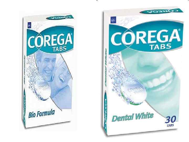 Ортопедическая стоматология Очищающие растворимые таблетки Корега Эффективное очищение зубных протезов обеспечивается за счет состава таблеток. В первую очередь за счет пероксида – вещество, способное образовывать активный кислород, который вступает в химическую реакцию с органическими компонентами налета и расщепляет их, оказываю также сильный антибактериальный и дезодорирующий эффект. Бикарбонат натрия нейтрализует кислотную активность бактерий, вызывающих болезни зубов, десен и неприятный запах. Лимонная кислота обладает отбеливающими свойствами. Corega Tabs Bio Formula – для ежедневного очищения зубных протезов. Corega Tabs Dental White – обладают дополнительным отбеливающим эффектом за счет повышенного содержания активного кислорода и бикарбоната натрия; хорошо удаляют налет, образующийся в результате курения, употребления кофе и чая.