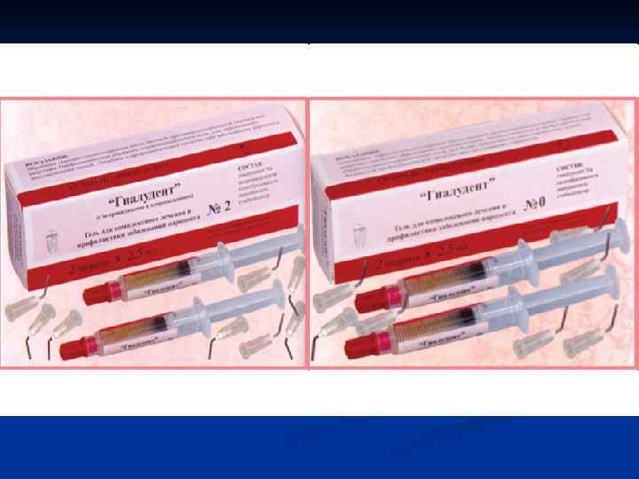 “Гиалудент” № 1 - с хлоргексидином “Гиалудент” № 2 - с метронидазолом и хлоргексидином “Гиалудент Гель”- гиалуронат Na "Гиалудент Гель" № 0 - гиалуронат Na, трилон Б, клуцел, хлорбензиловый спирт "Гиалудент Гель" № 1 - с хлоргексидином "Гиалудент Гель" № 2 - с метронидазолом и хлоргексидином "Гиалудент Гель" № 3 - с витаминами и ангиопротектором "Гиалудент Гель" № 4 - с доксициклином