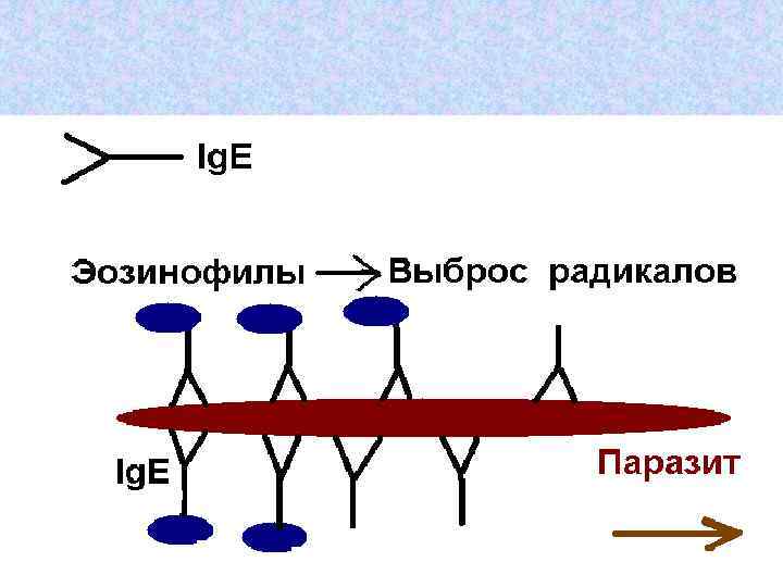 • Ig. E антитела связываются с базофилами и тучными клетками • При встрече с паразитом они вызывают выброс гистамина и других биологически активных веществ из этих клеток • Гистамин привлекает эозинофилы, которые оказывают повреждающее действие на паразитов • Ig. E может вырабатываться против непаразитарных антигенов, что приводит к аллергиям