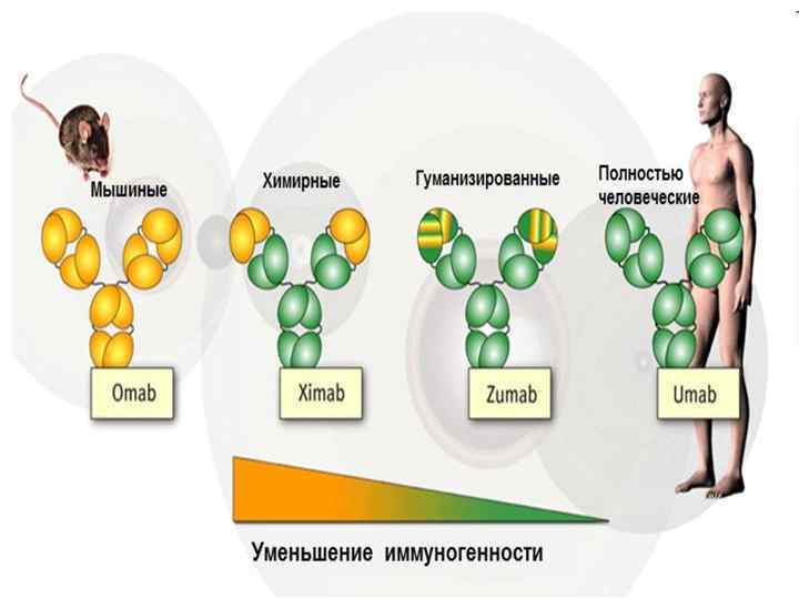 Химерные антитела получили окончание «-ximab» Гуманизированные антитела имеют окончание «-zumab» Препараты на основе мон-АТ - оканчиваются на «–mab» (от monoclonal antibody). Полностью человеческие антитела имеют окончание – «-umab» .