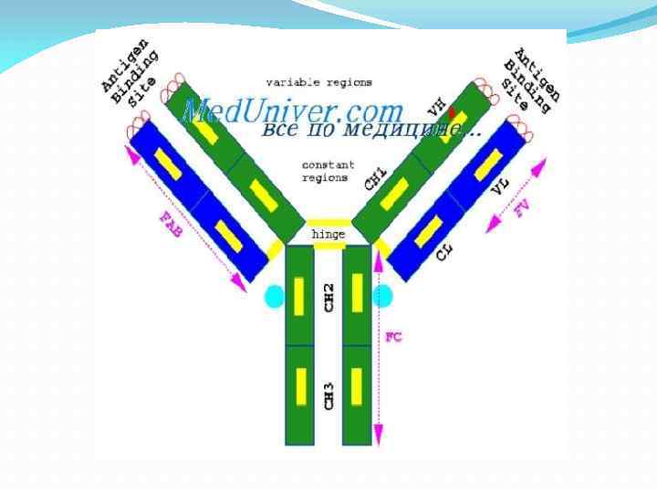 Антитела являются относительно крупными (~150 к. Да— Ig. G) , гликопротеинами имеющими сложное строение. Состоят из двух идентичных тяжелых цепей (H-цепи, в свою очередь состоящие из VH, CH 1, шарнира, CH 2 и CH 3 доменов) и из двух идентичных (L-цепей, состоящих из VL и CL доменов). К тяжелым цепям ковалентно присоединены олигосахариды. При помощи протеазы папаина антитела можно расщепить на два Fab (англ. fragment antigen binding — антигенсвязывающий фрагмент) и один Fc (англ. fragment crystallizable — фрагмент, способный к кристаллизации).