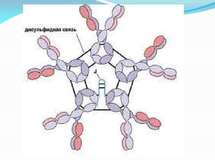 Ig. M представляют собой пентамер основной четырехцепочечной единицы, содержащей две μ-цепи. При этом каждый пентамер содержит одну копию полипептида с J -цепью (20 к. Да), который синтезируется антителообразующей клеткой и ковалентно связывается между двумя соседними FC-фрагментами иммуноглобулина. Появляются при первичном иммунном ответе Bлимфоцитами на неизвестный антиген, составляют до 10 % фракции иммуноглобулинов. Являются наиболее крупными иммуноглобулинами (970 к. Да). Содержат 10 -12 % углеводов. Образование Ig. M происходит ещё в пре-B-лимфоцитах, в которых первично синтезируются из μ-цепи; синтез лёгких цепей в пре-B-клетках обеспечивает их связывание с μцепями, в результате образуются функционально активные Ig. M, которые встраиваются в поверхностные структуры плазматической мембраны, выполняя роль антиген распознающего рецептора; с этого момента клетки пре-Bлимфоцитов становятся зрелыми и способны участвовать в