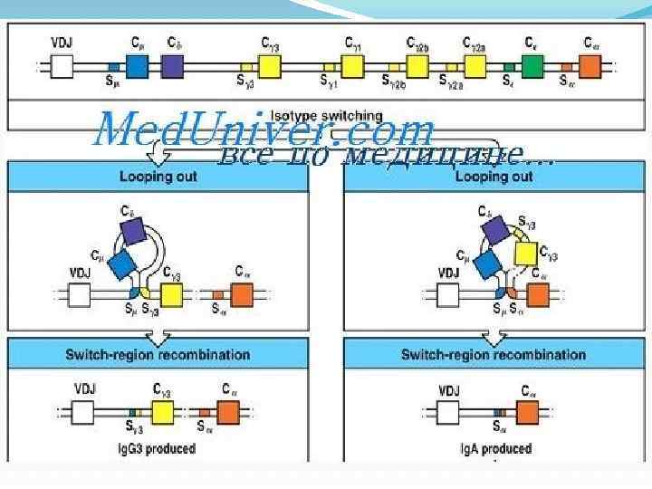 Вариабельность антител Антитела являются чрезвычайно вариабельными (в организме одного человека может существовать до 108 вариантов антител). Все разнообразие антител проистекает из вариабельности как тяжёлых цепей, так и лёгких цепей. У антител, вырабатываемых тем или иным организмом в ответ на те или иные антигены, выделяют: Изотипическая вариабельность — проявляется в наличии классов антител (изотипов), различающихся по строению тяжёлых цепей и олигомерностью, вырабатываемых всеми организмами данного вида; Аллотипическая вариабельность — проявляется на индивидуальном уровне в пределах данного вида в виде вариабельности аллелей иммуноглобулинов — является генетически детерминированным отличием данного организма от другого; Идиотипическая вариабельность — проявляется в различии аминокислотного состава антиген-связывающего участка. Это касается вариабельных и гипервариабельных доменов тяжёлой и лёгкой цепей, непосредственно контактирующих с антигеном.