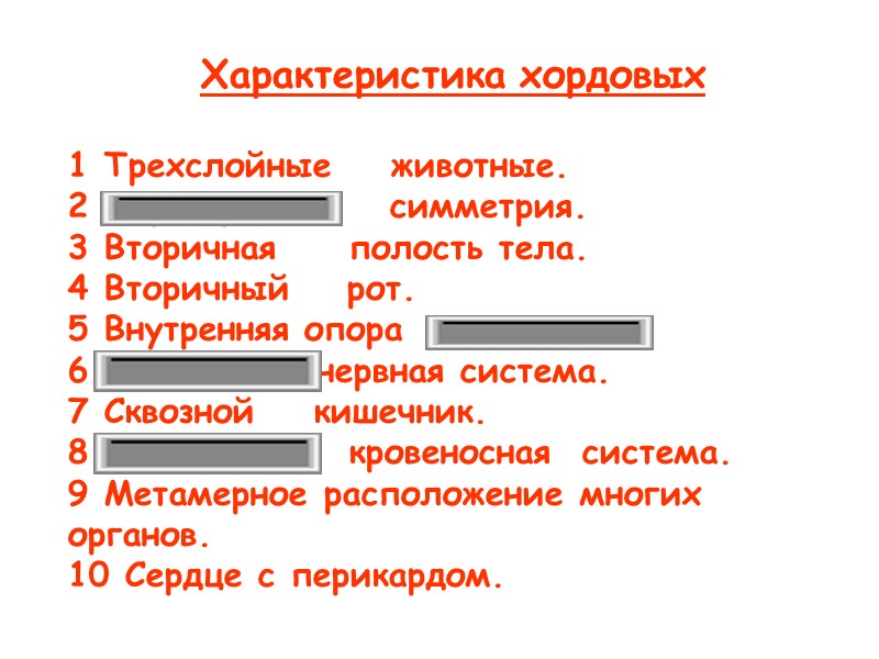 Характеристика хордовых 1 Трехслойные животные. 2 Двусторонняя симметрия. 3 Вторичная полость тела. 4 Вторичный рот. 5 Внутренняя опора -хорда. 6 Трубчатая нервная система. 7 Сквозной кишечник. 8 Замкнутая кровеносная система. 9 Метамерное расположение многих органов. 10 Сердце с перикардом.
