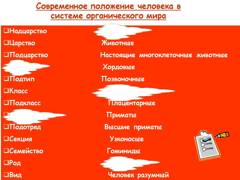 Современное положение человека в системе органического мира Надцарство Эукариоты Царство Животные Подцарство Настоящие многоклеточные животные Тип Хордовые Подтип Позвоночные Класс Млекопитающие Подкласс Плацентарные Отряд Приматы Подотряд Высшие приматы Секция Узконосые Семейство Гоминиды Род Человек Вид Человек разумный