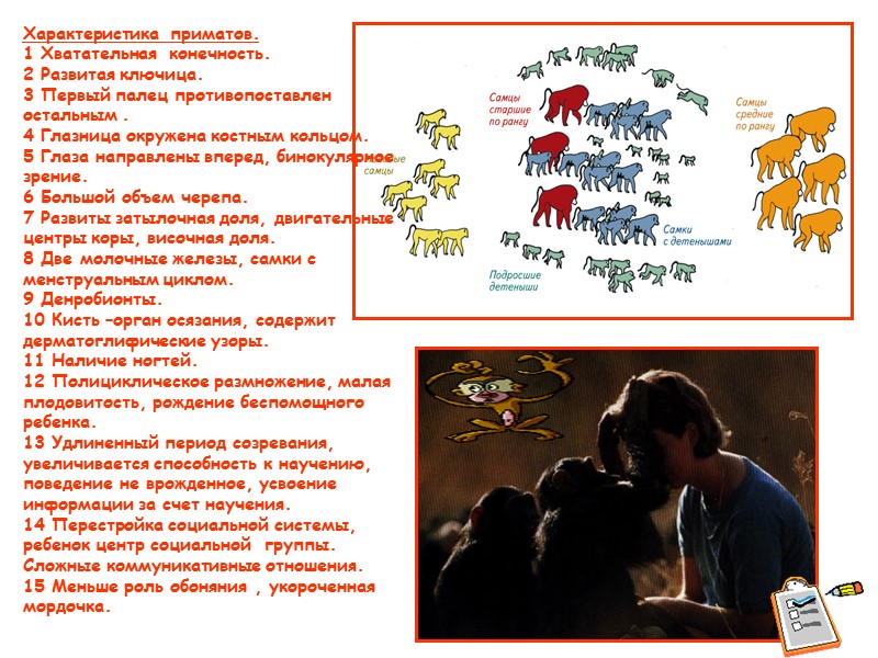 Характеристика приматов. 1 Хватательная конечность. 2 Развитая ключица. 3 Первый палец противопоставлен остальным . 4 Глазница окружена костным кольцом. 5 Глаза направлены вперед, бинокулярное зрение. 6 Большой объем черепа. 7 Развиты затылочная доля, двигательные центры коры, височная доля. 8 Две молочные железы, самки с менструальным циклом. 9 Денробионты. 10 Кисть –орган осязания, содержит дерматоглифические узоры. 11 Наличие ногтей. 12 Полициклическое размножение, малая плодовитость, рождение беспомощного ребенка. 13 Удлиненный период созревания, увеличивается способность к научению, поведение не врожденное, усвоение информации за счет научения. 14 Перестройка социальной системы, ребенок центр социальной группы. Сложные коммуникативные отношения. 15 Меньше роль обоняния , укороченная мордочка.