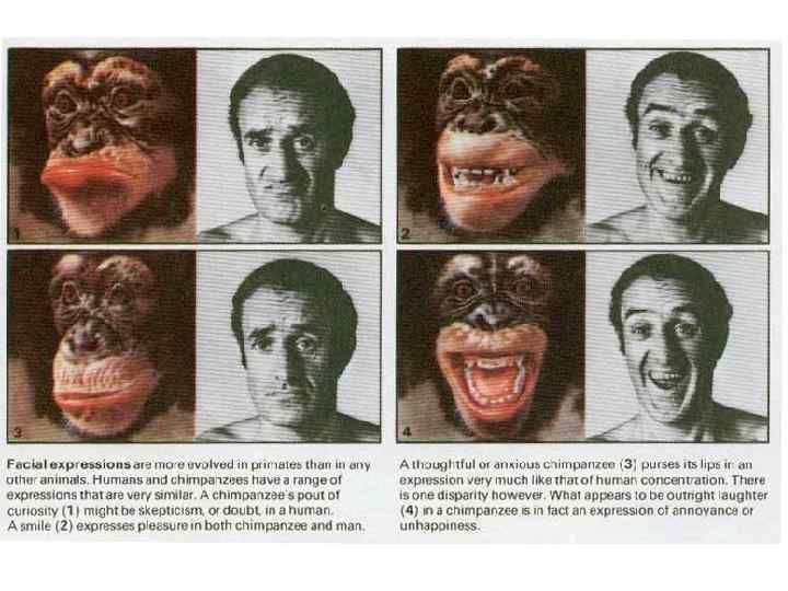 Типичные признаки мозга человека: 1. Большие общие размеры мозга (шимпанзе 320 -550 см 3 ; человек 1400 см 3 ); 2. Специфические поля мозга (зона Брока, Вернике и др. ); 3. Строение долей мозга (развиты лобная доля и нижняя теменная долька, височная и лобная доли сходятся под острым углом, височная доля широкая и округлая спереди, затылочная доля относительно небольшая, нависает над мозжечком) Мозг шимпанзе (вверху) и человека (внизу)