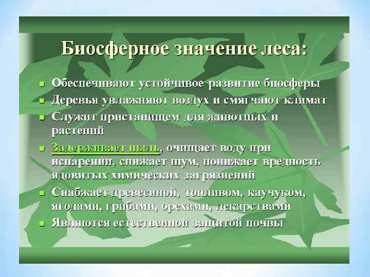 Лес играет важнейшую роль в нормальном функционировании природных экосистем. Они поглощают атмосферные загрязнения антропогенного происхождения, защищают почву от эрозии, регулируют нормальный сток поверхностных вод, препятствуют снижению уровня грунтовых вод и заиливанию рек, каналов и водохранилищ. Сведение лесов влечет за собой гибель их богатейших флоры и фауны. Человек обедняет облик своей планеты.