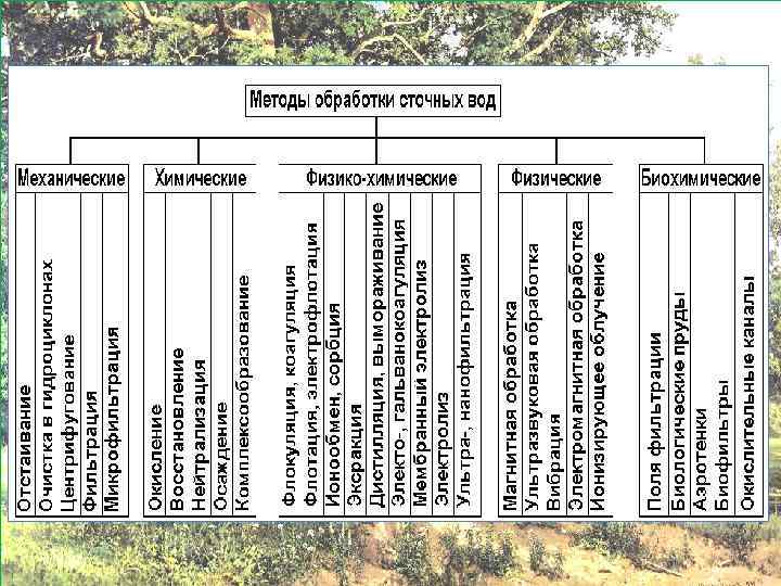 Промышленные сточные воды от примесей очищают механическими, химическими, физико-химическими, биологическими и термическими методами. Названные методы подразделяют на рекуперационные и деструктивные. Рекуперационные предусматривают извлечение из сточных вод и дальнейшую переработку ценных веществ. При деструктивных методах вещества, загрязняющие воды, подвергают разрушению путем окисления или восстановления. Продукты разрушения удаляют из воды в виде газов или осадков. Механическую очистку сточных вод применяют при отделении твердых нерастворимых примесей. Для этой цели используют методы процеживания, отстаивания и фильтрования. Химические методы очистки применяют для удаления из сточных вод растворимых примесей. Наиболее распространены методы нейтрализации и окисления активным хлором, кислородом воздуха, озоном и др.