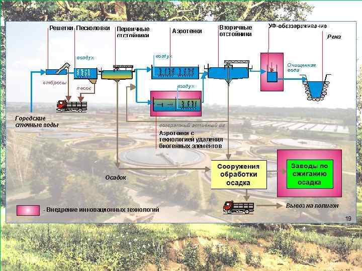 Эвтрофирование водных объектов. Различают две жизненные формы водных растительных организмов: бентосную и фитопланктонную. Бентосная растительность - водная трава, развивается прикрепившись ко дну, питательные вещества (биогены) берет из донных отложений, но нуждается в проникновении сквозь толщу воды достаточного для фотосинтеза солнечного света. Там где вода чистая много водной травы, глубинные воды обогащаются кислородом, трава служит пищей, убежищем для рыб, моллюсков. Фитопланктон – микроскопические водоросли, развиваются у поверхности или на поверхности воды, мутность воды на него не влияет, он сам является причиной помутнения воды. Фотосинтез фитопланктона не пополняет глубинные воды кислородом (кислород, выделяемый фитопланктоном, улетучивается в атмосферу). Биогенные вещества он берет из воды, чем больше их в воде, тем больше фитопланктона. У фитопланктона жизненный цикл очень короткий, он быстро отмирает, при его разложении бактерии (редуценты) потребляют много кислорода, сокращая тем самым содержание его в воде. Эвтрофированием называется обогащение водных объектов биогенными веществами, стимулирующими рост фитопланктона, что приводит увеличению мутности воды, гибели бентосной растительности, снижению концентрации растворенного кислорода. Обитающие на глубине рыбы, моллюски при этом задыхаются. Рост фитопланктона вызывает “цветение” воды, она имеет неприятный, гнилостный запах, не пригодна к использованию. Чтобы это не происходило, необходимо сокращать поступление биогенных веществ и наносов в водные объекты. Наносы еще больше усложняют эту проблему. Основным источником наносов является поверхностный сток, смывающий обнаженные грунты на строительных площадках, не закрепленную растительностью почву, отходы из отвалов и т. д. Основными источниками биогенов являются почвы, удобрения, пестициды, отходы животноводства, смываемые поверхностным стоком с сельскохозяйственных угодий, с газонов, со строительных площадок, недостаточно очищенные коммунально-бытовые, промышленные сточные воды, содержащие в своем составе, органические вещества, детергенты и др.