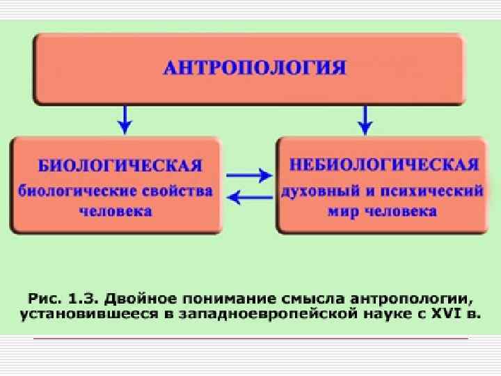 o o Антропология стала биологической наукой о строении человеческого тела (сравнительная анатомия и морфология человека), о многообразии его форм (расоведение), а также о происхождении и эволюции человека (антропогенез).
