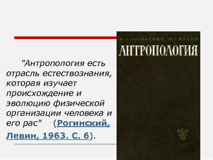 "Антропология есть отрасль естествознания, которая изучает происхождение и эволюцию физической организации человека и его рас" (Рогинский, Левин, 1963. С. 6).