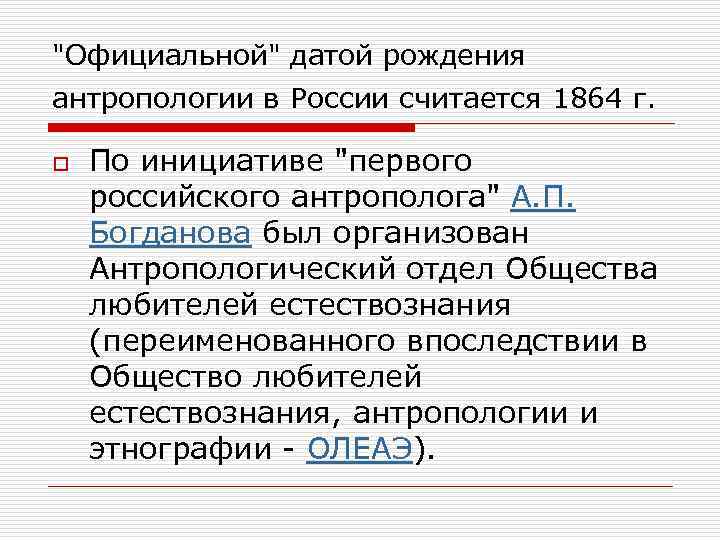 "Официальной" датой рождения антропологии в России считается 1864 г. o По инициативе "первого российского антрополога" А. П. Богданова был организован Антропологический отдел Общества любителей естествознания (переименованного впоследствии в Общество любителей естествознания, антропологии и этнографии - ОЛЕАЭ).