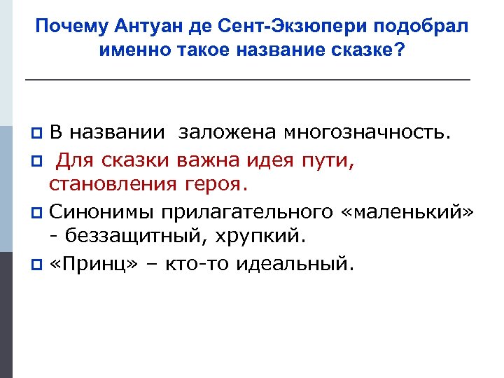 Почему Антуан де Сент-Экзюпери подобрал именно такое название сказке? В названии заложена многозначность. p Для сказки важна идея пути, становления героя. p Синонимы прилагательного «маленький» - беззащитный, хрупкий. p «Принц» – кто-то идеальный. p