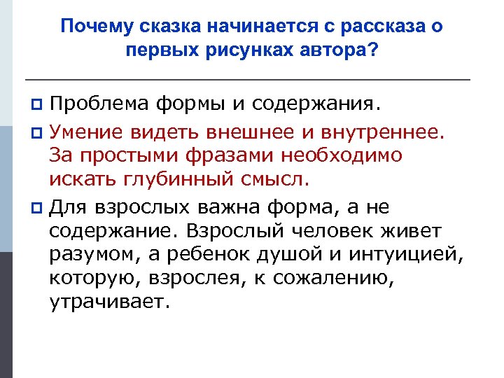 Почему сказка начинается с рассказа о первых рисунках автора? Проблема формы и содержания. p Умение видеть внешнее и внутреннее. За простыми фразами необходимо искать глубинный смысл. p Для взрослых важна форма, а не содержание. Взрослый человек живет разумом, а ребенок душой и интуицией, которую, взрослея, к сожалению, утрачивает. p