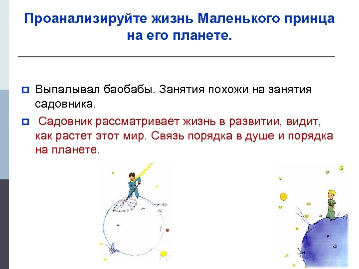 Проанализируйте жизнь Маленького принца на его планете. p p Выпалывал баобабы. Занятия похожи на занятия садовника. Садовник рассматривает жизнь в развитии, видит, как растет этот мир. Связь порядка в душе и порядка на планете.