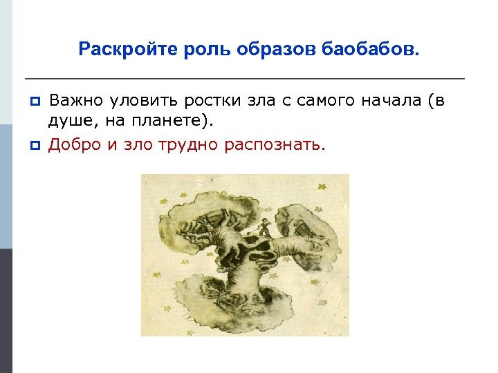 Раскройте роль образов баобабов. p p Важно уловить ростки зла с самого начала (в душе, на планете). Добро и зло трудно распознать.