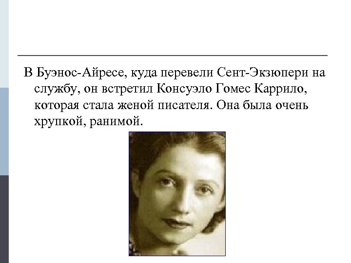 В Буэнос-Айресе, куда перевели Сент-Экзюпери на службу, он встретил Консуэло Гомес Каррило, которая стала женой писателя. Она была очень хрупкой, ранимой.