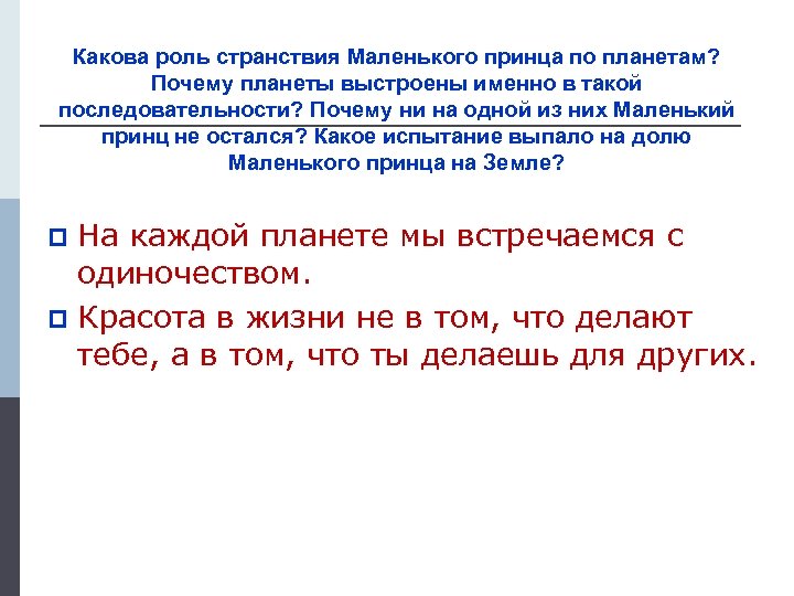 Какова роль странствия Маленького принца по планетам? Почему планеты выстроены именно в такой последовательности? Почему ни на одной из них Маленький принц не остался? Какое испытание выпало на долю Маленького принца на Земле? На каждой планете мы встречаемся с одиночеством. p Красота в жизни не в том, что делают тебе, а в том, что ты делаешь для других. p