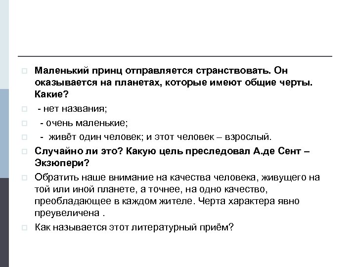 p p p p Маленький принц отправляется странствовать. Он оказывается на планетах, которые имеют общие черты. Какие? - нет названия; - очень маленькие; - живёт один человек; и этот человек – взрослый. Случайно ли это? Какую цель преследовал А. де Сент – Экзюпери? Обратить наше внимание на качества человека, живущего на той или иной планете, а точнее, на одно качество, преобладающее в каждом жителе. Черта характера явно преувеличена. Как называется этот литературный приём?