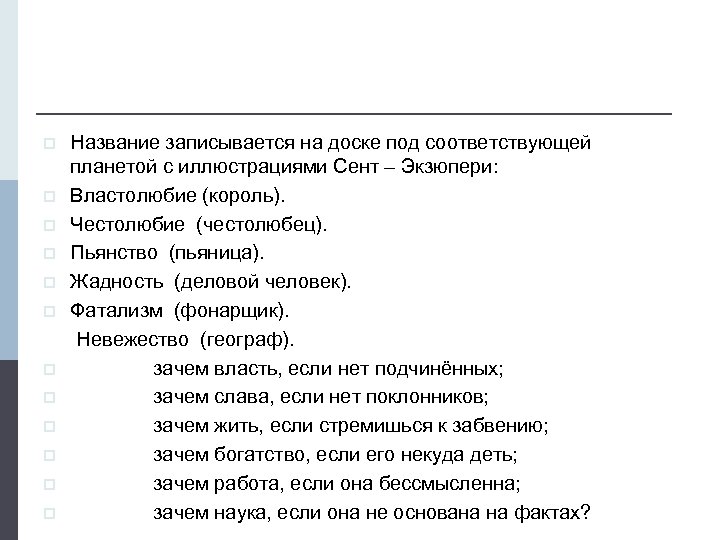 p p p Название записывается на доске под соответствующей планетой с иллюстрациями Сент – Экзюпери: Властолюбие (король). Честолюбие (честолюбец). Пьянство (пьяница). Жадность (деловой человек). Фатализм (фонарщик). Невежество (географ). зачем власть, если нет подчинённых; зачем слава, если нет поклонников; зачем жить, если стремишься к забвению; зачем богатство, если его некуда деть; зачем работа, если она бессмысленна; зачем наука, если она не основана на фактах?