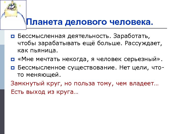 Планета делового человека. Бессмысленная деятельность. Заработать, чтобы зарабатывать ещё больше. Рассуждает, как пьяница. p «Мне мечтать некогда, я человек серьезный» . p Бессмысленное существование. Нет цели, чтото меняющей. Замкнутый круг, но польза тому, чем владеет… Есть выход из круга… p