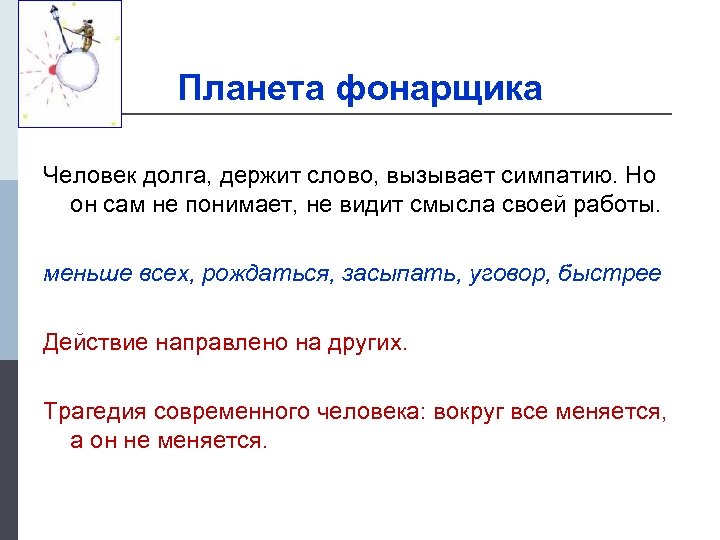 Планета фонарщика Человек долга, держит слово, вызывает симпатию. Но он сам не понимает, не видит смысла своей работы. меньше всех, рождаться, засыпать, уговор, быстрее Действие направлено на других. Трагедия современного человека: вокруг все меняется, а он не меняется.
