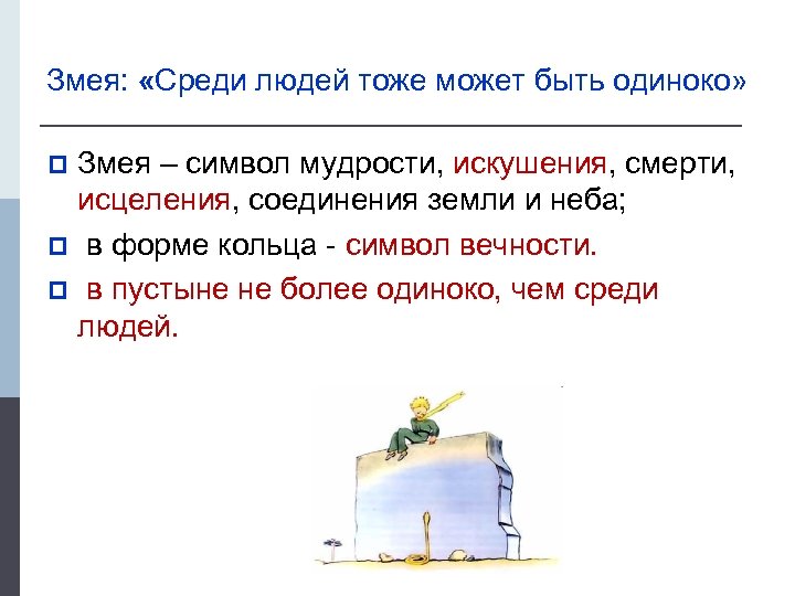 Змея: «Среди людей тоже может быть одиноко» Змея – символ мудрости, искушения, смерти, исцеления, соединения земли и неба; p в форме кольца - символ вечности. p в пустыне не более одиноко, чем среди людей. p