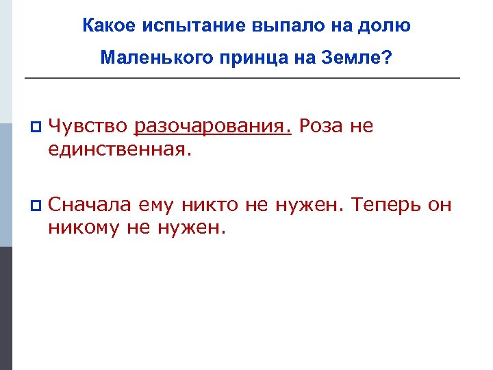 Какое испытание выпало на долю Маленького принца на Земле? p Чувство разочарования. Роза не единственная. p Сначала ему никто не нужен. Теперь он никому не нужен.