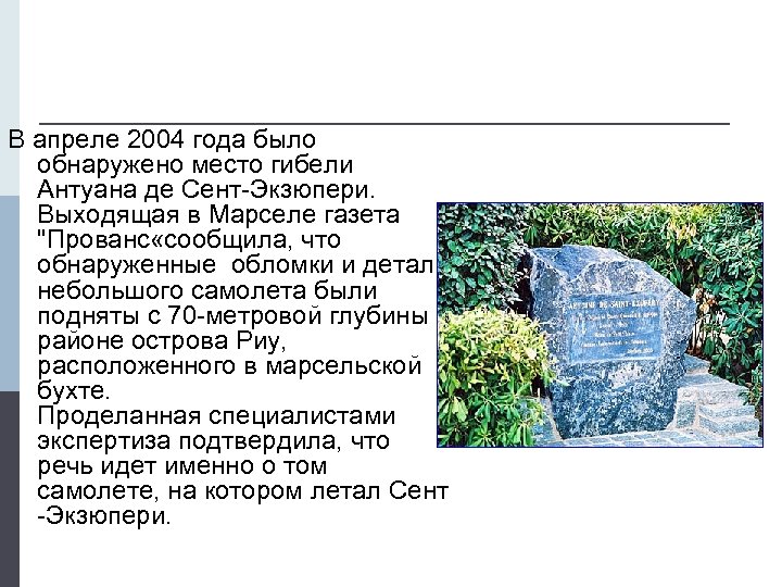 В апреле 2004 года было обнаружено место гибели Антуана де Сент-Экзюпери. Выходящая в Марселе газета "Прованс «сообщила, что обнаруженные обломки и детали небольшого самолета были подняты с 70 -метровой глубины в районе острова Риу, расположенного в марсельской бухте. Проделанная специалистами экспертиза подтвердила, что речь идет именно о том самолете, на котором летал Сент -Экзюпери.