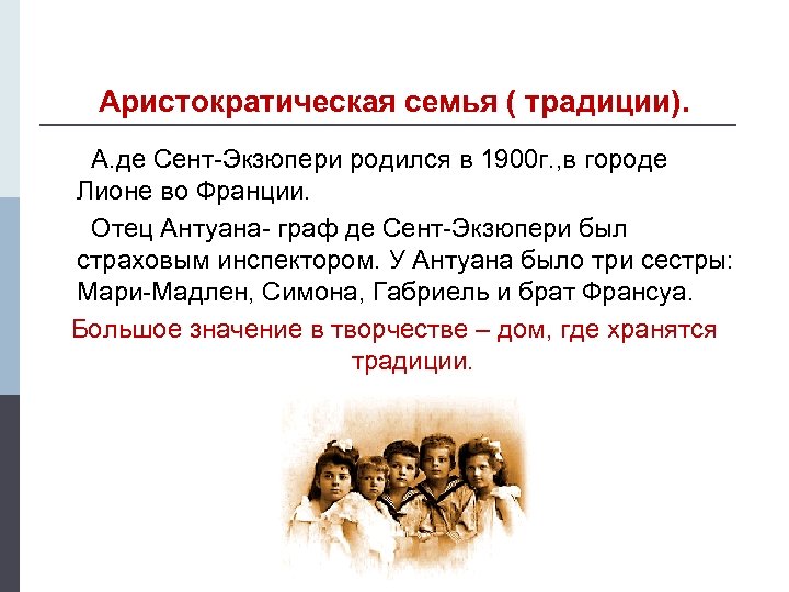 Аристократическая семья ( традиции). А. де Сент-Экзюпери родился в 1900 г. , в городе Лионе во Франции. Отец Антуана- граф де Сент-Экзюпери был страховым инспектором. У Антуана было три сестры: Мари-Мадлен, Симона, Габриель и брат Франсуа. Большое значение в творчестве – дом, где хранятся традиции.