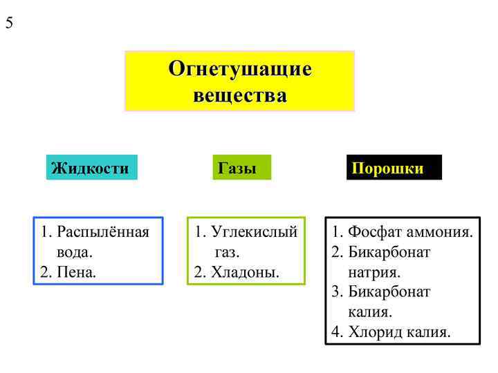 4 Средства тушения пожара (продолжение) 3. Пожарные системы (водяная, пенная, углекислотная). Водяная система наиболее эффективна для тушения древесины, ткани, бумаги. Эти системы делят на неавтоматические(пожарный водопровод) и автоматические. Пенная система наиболее эффективна для тушения нефтепродуктов. Углекислотные системы в основном используют для тушения нефтепродуктов и электроустановок. Анв