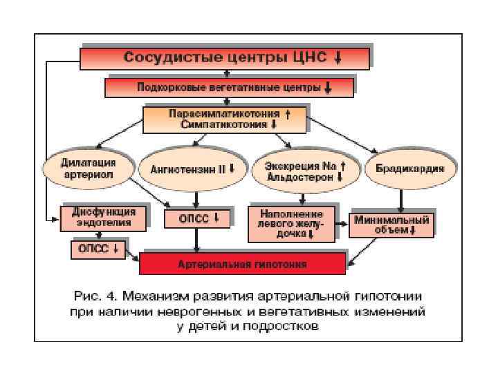 Патогенез: • Патогенез гипотонии у детей до сихпор изучен недостаточно. Не выявлены типичные причины болезни, но существует множество теорий: гуморальная, нейрогенная, вегетативная, конституциональноэндокринная. Сегодня считается четко доказанным нарушение механизмов ауторегуляции центральной гемодинамики — несоответствие между сердечным выбросом и общим периферическим сосудистым сопротивлением, как правило, за счет снижения последнего. Во время течения гипотензии (гипотонии) у детей общее периферическое сопротивление продолжает снижаться. • У детей и подростков наиболее значимым механизмом снижения периферического сопротивления является вегетативный. Чрезвычайно важно в развитии патологического процесса и участие биологически активных соединений с гипотензивными свойствами – простагландины, оксид азота, натрийуретические пептиды, кинины и пр.