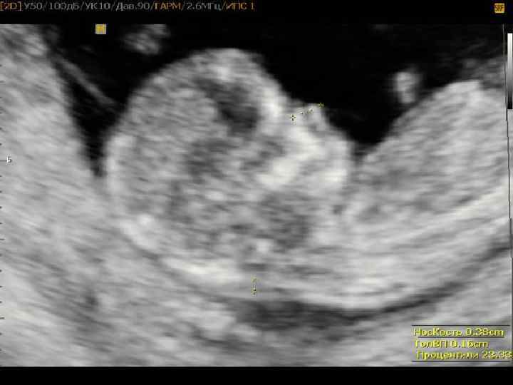 Пренатальный скрининг первого триместра Кроме перечисленных выше измерений при проведении УЗИ плода в 12 недель беременности проводится скрининг на хромосомные патологии плода. Установленно, что большинство хромосомных патологий сопровождаются увеличением воротникового пространства, расположенного в области шеи плода. Такая особенность вызвана тем, что при хромосомных аномалиях плода, в частности при синдроме Дауна, кожа имеет повышенную складчатость, т. е. , грубо говоря, кожи больше. Под такой кожей накапливается жидкость, которая и способствует визуализации при УЗИ плода в 12 недель беременности утолщение воротниковой зоны. У плодов с нарушением кариотипа (при хромосомных болезнях) толщина воротниковой зоны на 2, 5 мм (и более) больше, чем среднее значение для данного срока беременности у плодов с нормальным кариотипом.