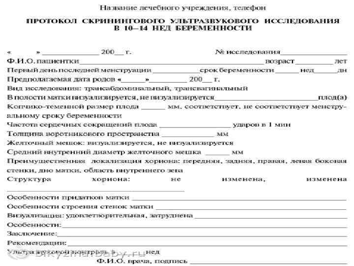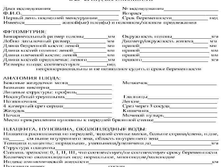Структуру протокола УЗИ можно разделить на следующие основные группы: -Сведения о пациентке (ФИО, возраст, начало последней менструации) -Фетометрия (измерение основных размеров плода) -Анатомия плода (органы и системы) -Провизорные органы (существующие временно, такие как плацента, пуповина и околоплодные воды) -Заключение и рекомендации В данном протоколе, как и при УЗИ в 10 -14 недель, указывается первый день последней менструации, относительно которого рассчитывается срок беременности. Также отмечается количество плодов и то, что плод является живым (это определяется по наличию сердцебиения и движениям плода). При наличии двух и более плодов каждый изучается и описывается отдельно. Обязательно указывается предлежание плода (отношение крупной части плода ко входу в таз). Оно может быть головным (плод предлежит головкой) и тазовым (предлежат ягодицы и/или ножки). Плод может располагаться поперечно, что должно быть отражено в протоколе.