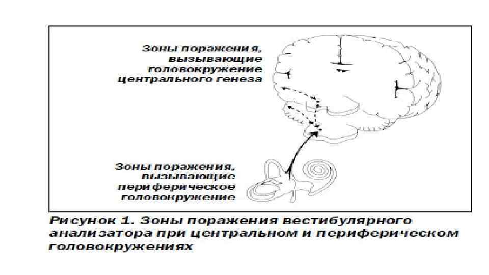 Головокружение Вестибулярное Невестибулярное Под вестибулярным головокружением понимают иллюзию движения самого человека или предметов окружающей среды. Вестибулярное (истинное или системное) головокружение свидетельствует о патологии вестибулярного анализатора, причем как его периферического, так и центрального отделов. Все другие ощущения, которые отличаются от системного головокружения (расстройства равновесия — неустойчивость, пошатывание; чувство опьянения и дурноты; синкопальные и предобморочные состояния; «пелена» перед глазами, «пустота и легкость» в голове и прочие ощущения дискомфорта в голове) не связаны с патологией вестибулярного анализатора и носят название невестибулярного (несистемного) головокружения. Центральное возникает в центральных отделах. от ядер вестибулярного нерва в стволе головного мозга до височных долей коры больших полушарий Периферическое возникает в преддверии. если процесс локализуется во внутреннем ухе, вестибулярном нерве, мостомозжечковом углу и до ядер вестибулярного нерва в стволе головного мозга