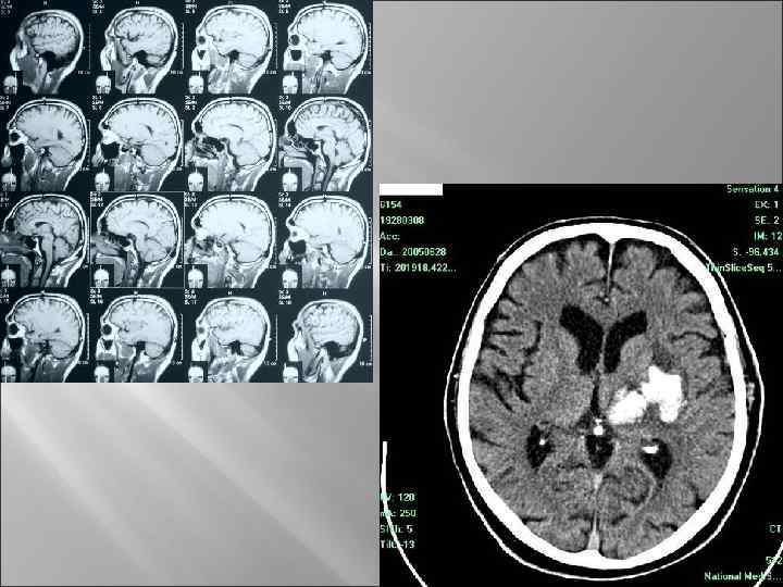 Компьютерная томография Метод основан на измерении и сложной компьютерной обработке разности поглощения рентгеновского излучения различными по плотности тканями. При КТ-исследовании головы – это покровные ткани, кости черепа, белое и серое вещество мозга, ликворные пространства. С помощью компьютерной томографии можно получить исчерпывающую информацию при сосудистых заболеваниях, травматических повреждениях, опухолях мозга, абсцессах, пороках развития и многих других заболеваниях головного и спинного мозга. Можно получать изображение сосудов мозга, воссоздавать объемное изображение черепа, мозга и позвоночника.