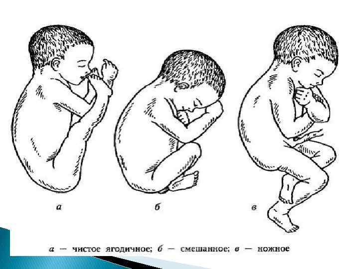 Клиническая классификация Чисто ягодичное предлежание Смешанное ножное • Предлежат ягодицы, ножки плода согнуты в тазобедранных суставах, разогнуты в коленных суставах и вытянуты вдоль туловища • Ножки полностью согнуты в коленных суставах и прижаты к животу плода • предлежат одна или обе стопы либо колени плод. Различают полное и неполное ножные предлежание. При полном ножном предлежаний предлежат обе ножки , при неполном – одна ножка или колени плода